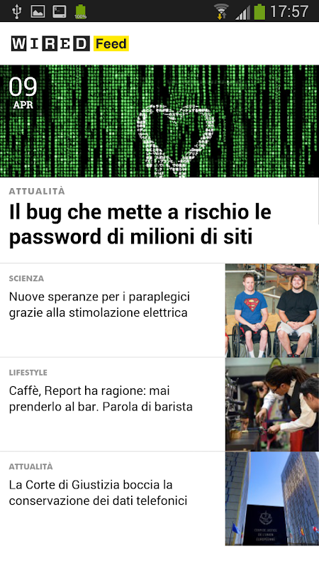 With Wired Feed you can read Wired on the move, and customize your news about internet, gadgets, mobile, science, economics, lifestyle, games. And yet the pills LOL, with all the most curious news and most viral videos, and insights from Ideas.