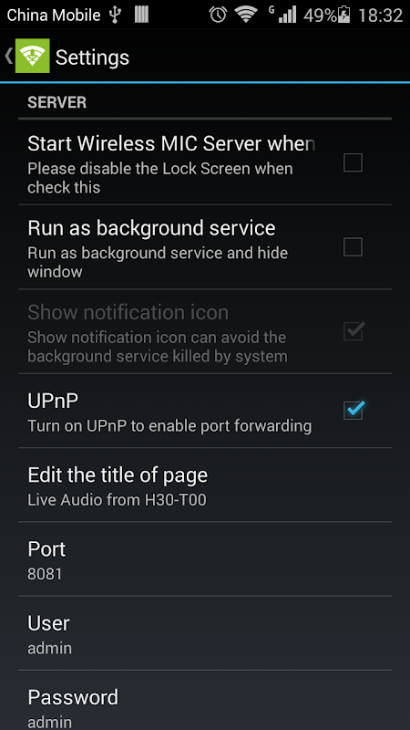 It supports UPnP port forwarding. If you can access your gateway via WAN, and the UPnP on your gateway is opened, you can also use WAN Url from WAN to visit Wireless MIC Server. And also supports user name and password authentication, default username and password are admin, you can modify the settings inside.