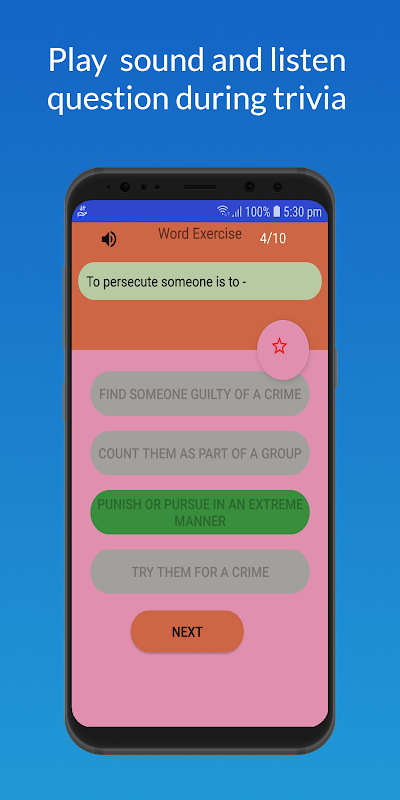 You can hear the questions and words during the quiz. Playing Word Exercise is the best way to learn new words not the boring dictionaries.