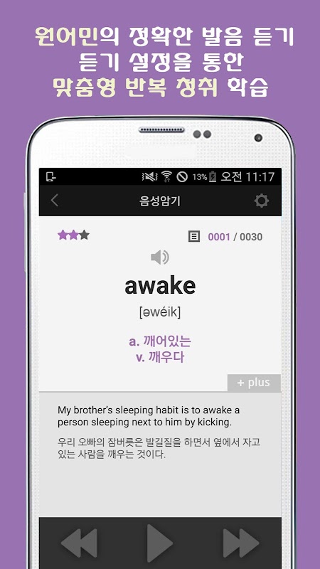 3. 음성암기 : 총 900단어에 대한 원어민 음성을 통해 정확한 발음 듣기는 물론 반복 청취 학습 및 암기가 가능합니다. 또한 듣기설정을 통해 맞춤 듣기 학습이 가능합니다.