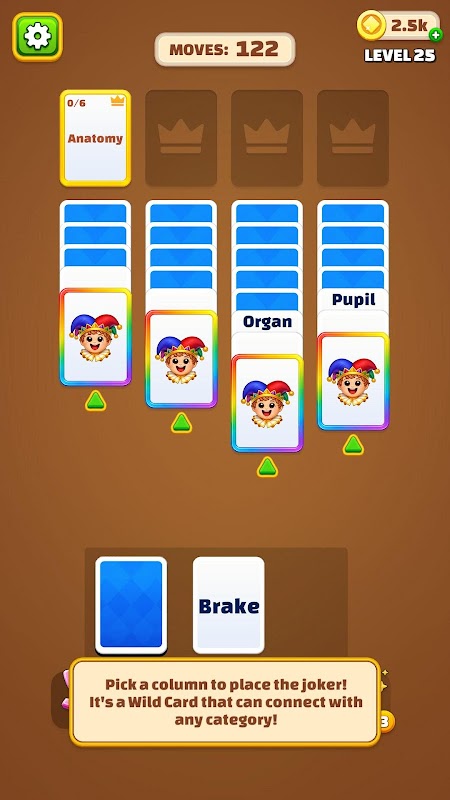 প্রতিটি স্তর ঐতিহ্যবাহী সলিটায়ারের মতো একটি পূর্ণাঙ্গ কার্ড বোর্ড দিয়ে শুরু হয়। প্রথমে, আপনি বোর্ডে একটি ক্যাটাগরি কার্ড রাখেন। তারপরে, আপনি সাবধানে শব্দ কার্ডগুলিকে সেই বিভাগে স্থানান্তর করেন যেখানে তারা থাকে। প্রতিটি পদক্ষেপ গুরুত্বপূর্ণ, তাই আপনাকে আগে থেকে চিন্তা করতে হবে এবং বিজ্ঞতার সাথে পরিকল্পনা করতে হবে।