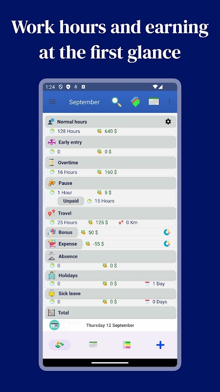 একটি সহজ এবং স্বজ্ঞাত ইন্টারফেসের মাধ্যমে 4 ঘন্টা কাজ করা আপনাকে আপনার কাজের সময়গুলিতে প্রবেশ করতে দেয় যা এতে থাকতে পারে: