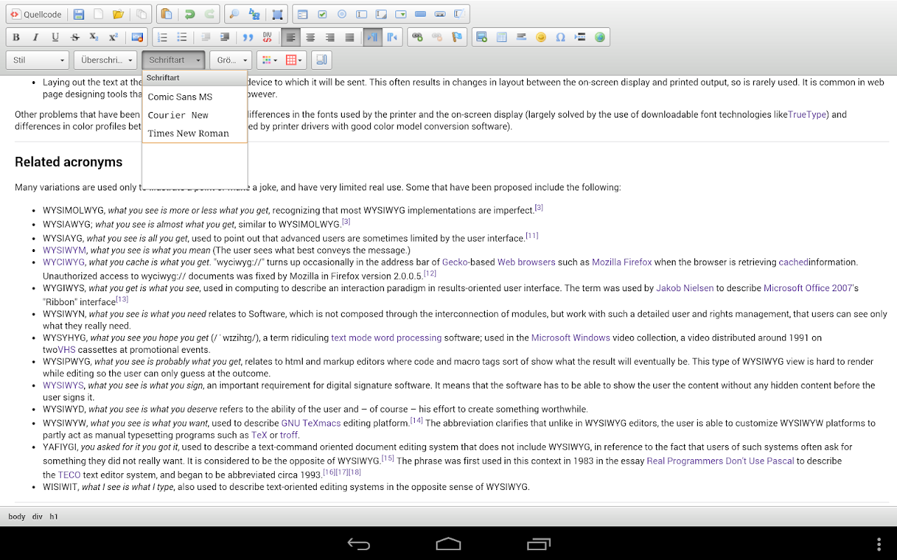 The WYSIWYG (What You See Is What You Get) html editor is a office like text editor to simplify web content creation. With this App you get common word processor features directly into your android device.