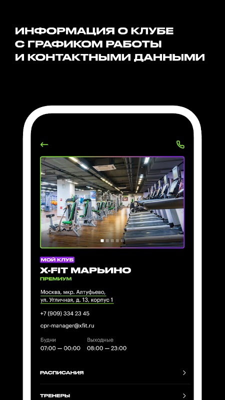 - получать полную информацию о клубах сети, включая фотографии и контакты;