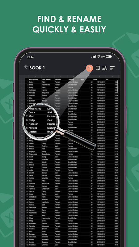 XLSX ফাইল রিডারে সমস্ত নথি দ্রুত অনুসন্ধান করার জন্য অনুসন্ধান বার রয়েছে