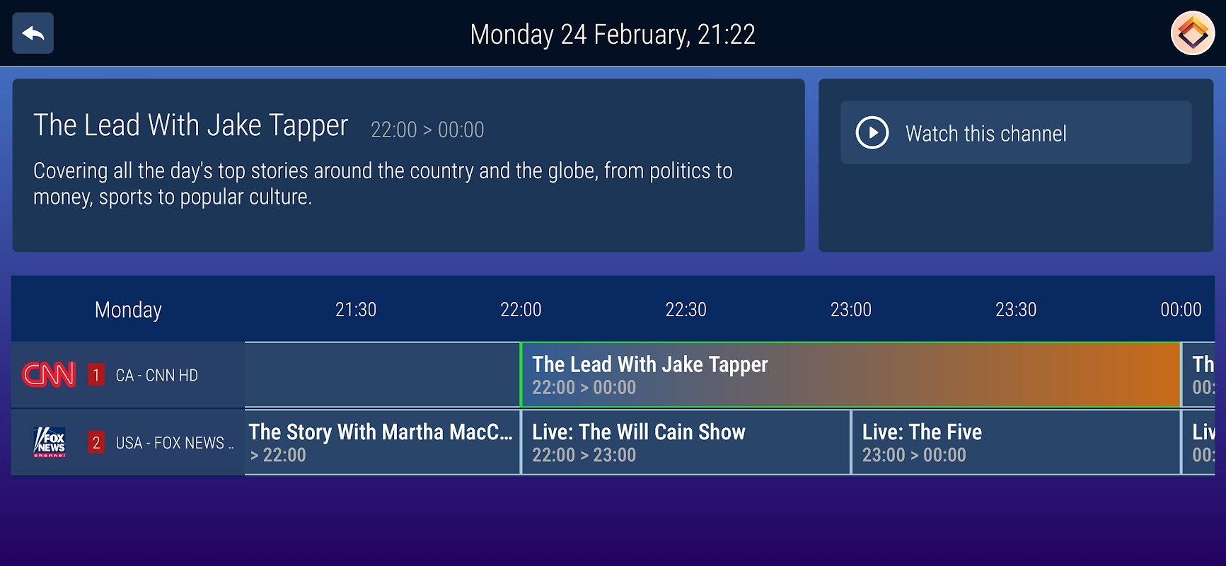 * নির্বাচিত তালিকার সমস্ত প্রোগ্রাম সহ টিভি গাইড (আপনার পছন্দের থেকে এটি ব্যবহার করার জন্য সুপারিশ করুন), উপলব্ধ থাকলে পুনরায় চালানোর বিকল্প