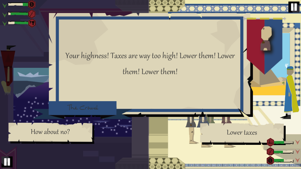 Your Highness! is a 2 player local multiplayer strategy game where you and your friend are each in control of a country and have to make choices in order to keep your kingdom in good order and destroy the other's kingdom!