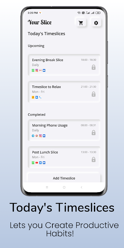 টাইমস্লাইসগুলি আপনার দিনের অংশগুলি যা আপনি একটি গ্রুপের অ্যাপ্লিকেশন ব্যবহারের জন্য আলাদা করে রেখেছেন। ফোন আসক্তি ভাঙ্গার জন্য, থাইস্লাইস আপনাকে পুরো দিন থেকে কিছু অ্যাপ্লিকেশনগুলিতে একটি নির্দিষ্ট সময় নির্ধারণ করতে সহায়তা করে। এই অ্যাপ্লিকেশনগুলি কেবল সেই টাইমলাইসের মধ্যেই ব্যবহার করা যেতে পারে এবং সারা দিন অবরুদ্ধ থাকে।