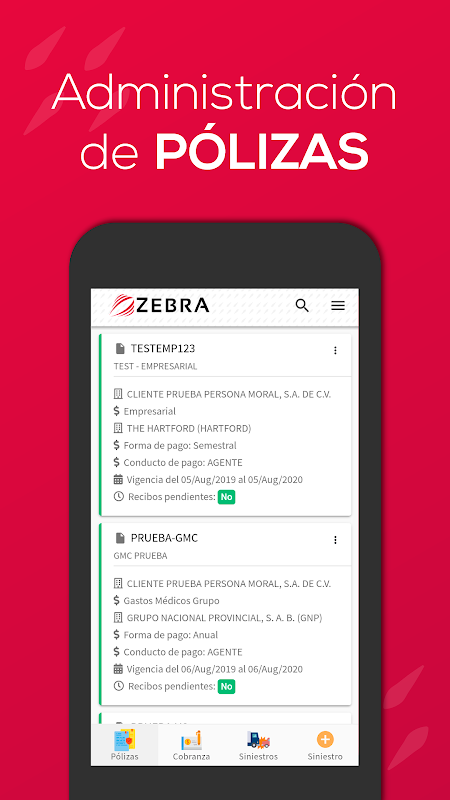 বীমা এবং বীমাকৃত প্রশাসকদের জন্য তৈরি অ্যাপ্লিকেশনটি উপস্থিত হয় যে তাদের সরবরাহকারীরা জেব্রা অ্যাপের সাথে যুক্ত। এতে আপনি যা কিছু করতে পারেন: