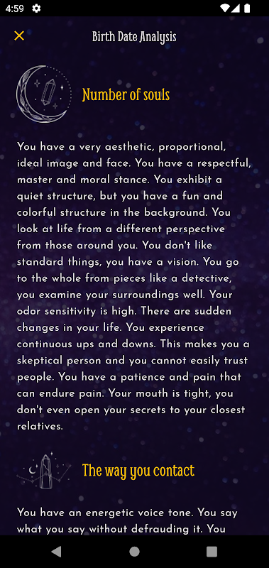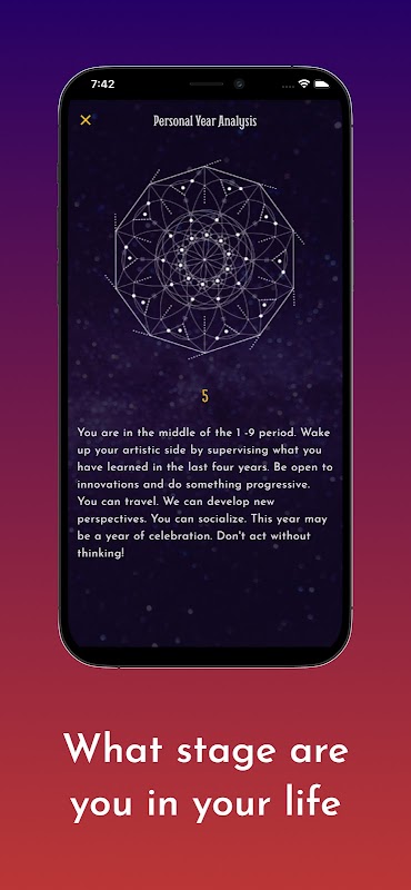 Zenith Numerology Application এর আরেকটি বৈশিষ্ট্য হল যে এটি মানুষকে তাদের জীবনের কোন পর্যায়ে রয়েছে এবং এই বছরে তাদের কোন ফোকাসে বসবাস করা উচিত তা পরীক্ষা করার অনুমতি দেয়, সংখ্যাতত্ত্বের ব্যক্তিগত বছরের গণনা। এটি কোন চক্রের মধ্যে রয়েছে তা খুঁজে বের করার মাধ্যমে আমাদের ব্যবহারকারীরা একটি আসন্ন সময়ের জন্য কী ধরনের সংখ্যাতাত্ত্বিক প্রভাব পড়বে তা বুঝতে পারেন। এই বৈশিষ্ট্যটি আমাদের ব্যবহারকারীদের সারা বছর ধরে তাদের কর্মের পরিকল্পনা করতে এবং তাদের জীবনের বিভিন্ন ক্ষেত্রে আরও সচেতন সিদ্ধান্ত নিতে সাহায্য করে।