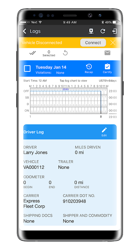 Zephyr ELD ডিভাইস স্বয়ংক্রিয়ভাবে ড্রাইভিং টাইম ট্র্যাক করে এবং রেকর্ড করে, ড্রাইভার স্ট্যাটাস সেট করার জন্য ব্যবহারের সহজতা প্রদান করে এবং আপনাকে দিনে বা সপ্তাহে ড্রাইভের অবশিষ্ট সময় দেখতে দেয়। সমস্ত ডেটা রেকর্ড আপনার স্মার্টফোন বা ট্যাবলেটে নিরাপদে সংরক্ষণ করা হয় এবং যখন প্রয়োজন হয়, রেকর্ডগুলি সহজেই পুনরুদ্ধার করা যায়।