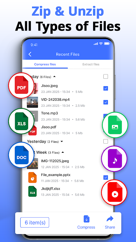 শক্তিশালী ফাইল কম্প্রেসার ক্ষমতা সহ, জিপ এক্সট্র্যাক্টর: আনরার-আনজিপ অ্যাপ আপনাকে স্টোরেজ স্পেস বাঁচাতে বা সহজে ভাগ করার জন্য প্রস্তুত করতে ফাইলগুলিকে সংকুচিত করতে দেয়। এটিতে একটি কম্প্রেস পিডিএফ ফাইল বৈশিষ্ট্যও রয়েছে, যা আপনাকে মানের সাথে আপস না করে পিডিএফ নথির আকার কমাতে দেয়। ইমেল সংযুক্তি, অনলাইন জমা বা ক্লাউড স্টোরেজের জন্য পিডিএফ ফাইলগুলিকে প্রায়শই সংকুচিত করার প্রয়োজন হয় এমন প্রত্যেকের জন্য এটি এটিকে একটি দুর্দান্ত সরঞ্জাম করে তোলে। Zip Extractor অ্যাপ আপনাকে Android ডিভাইসে Zip বা Rar আর্কাইভ বের করতে সাহায্য করে। 7zip, ZIPX, JAR, এবং অন্যান্য সংকুচিত ফাইলগুলি সহজে খুলুন। আপনার ফাইলগুলিকে সংগঠিত রাখতে এটি একটি উন্নত ফাইল ম্যানেজার টুল।