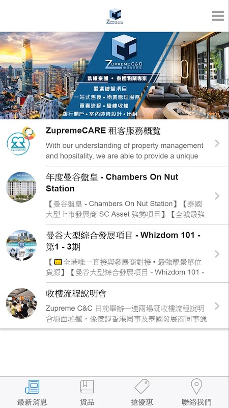 Zupreme C&C 紮根泰國及香港,為客戶搜羅高質素及具潛力的物業項目;我們的團隊重視買賣流程的每一步,由收樓驗樓,物業過戶,銀行開户,室內設計,裝修,傢俬電器配置,出租二手放售,物業維護管理等均一一涵蓋,因我們相信高品質的物業管理服務能夠強化單位在租務及二手市場的競爭力;