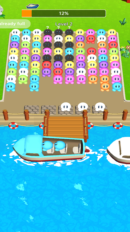 The game starts with a simple premise but quickly escalates in complexity as you progress. You'll need to keep an eye on the incoming characters and plan your moves carefully to achieve the goal of launching all the boats. Each correct match and successful boarding adds to the excitement, while the challenge lies in the strategic assembly of color groups.