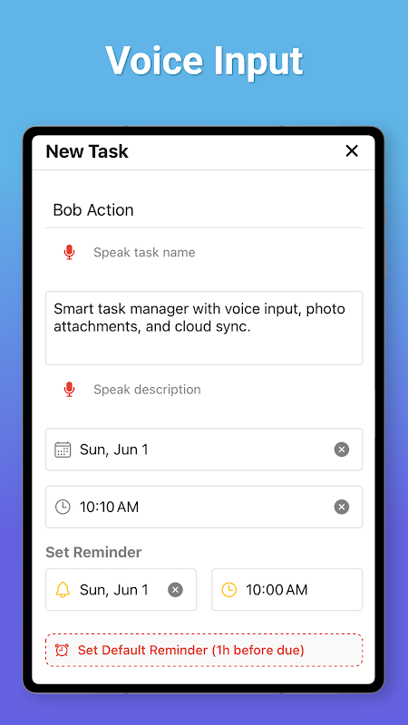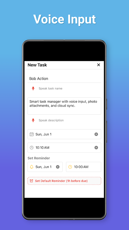 Smart task manager with voice input, photo attachments, and cloud sync.