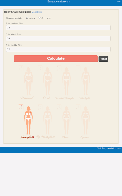 Use this online body shape calculator to find what type of body (straight, pear, spoon, hourglass, top hourglass, inverted triangle, oval, diamond) you have.