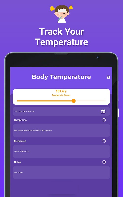 Thermometer For Fever is designed for the convenience of the users searching for any body temperature app. Launch this application and enter the values and save the values this application will automatically update the records. The application will view the records entered by the user, view the records and view the summary of the entered records with symptoms and memo. Thermometer For Fever is used to generate graphs statistical analysis and reports on the basis of entered reports. It can be recorded with symptoms such as runny nose and sore throat, so it will be very easy to tell the doctor about the symptoms.