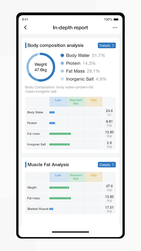 Compared with other ordinary body fat scales with 4 electrodes, our new scale has 8 electrodes to measure your full-body data more accurately. Simply sync 8-electrode scale data with your phone via BodyScan Pro APP, as the measurement is completed, it generates an in-depth report which give multi-dimensional comprehensive analysis to your body, Let’s get started!