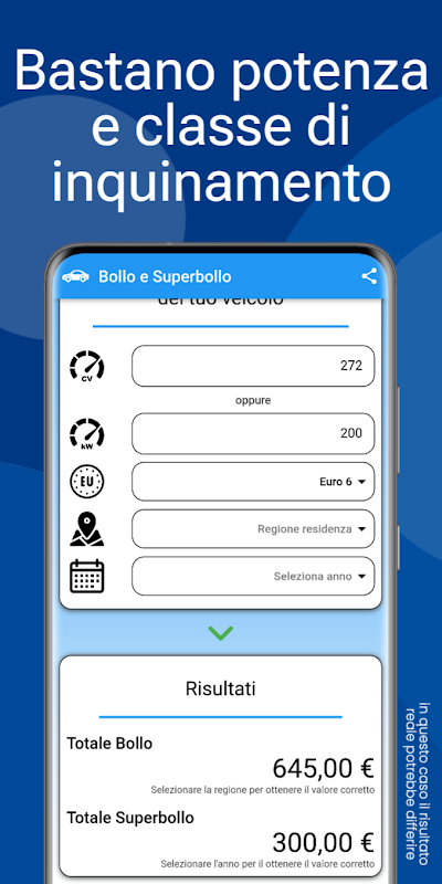 • Complete customization: Indicate the power of your vehicle in HP or kW, specify the pollution class and select your region of residence. Bollo e Superbollo adapts to your needs and provides you with detailed information on all applicable taxes.