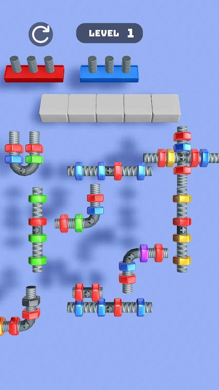 Every level presents a new array of bolts and nuts, intertwined in complex formations. Your goal is to strategically unscrew and match the correct pairs, ensuring that each nut is turned in the right order to fit its corresponding bolt. As you find the perfect matches, the excess pieces fall away, revealing a clean slate and paving the way for new puzzles.