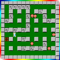 Doors leading to further maze rooms are found under rocks, which Bomberman must destroy with bombs.