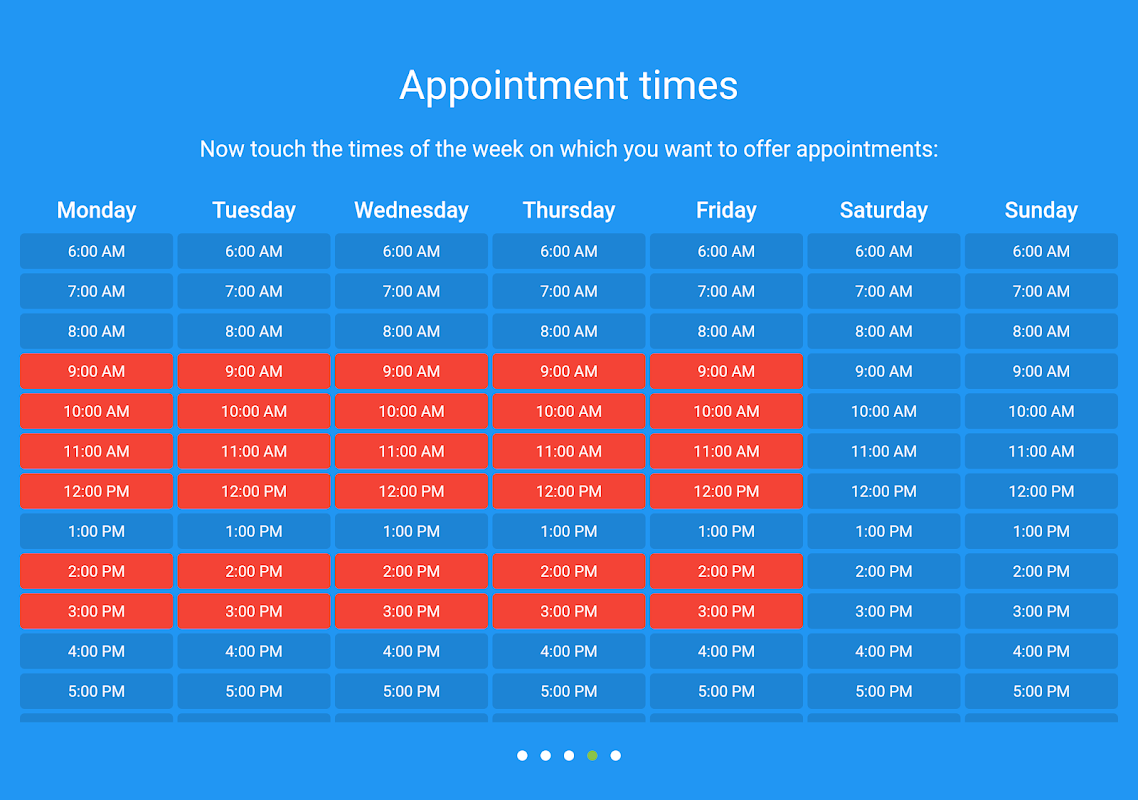 You can select at which times of the week you would like to offer appointments, how long the appointments are, if a client can book multiple consecutive appointments and if clients need to sign up first or if they can just enter their name and other data. You can configure what they have to enter by adding custom fields.