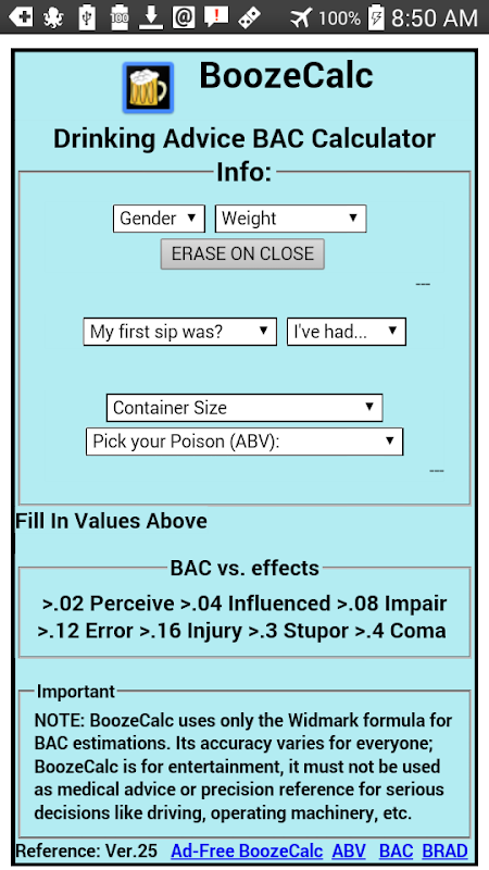 BoozeCalc uses only math, not measurements to determine Blood Alcohol Content. Though results seem to be "spot on" for the majority. It can be completely inaccurate for some people's physiologies. Since it is not a "measured" value it cannot be relied upon for accuracy in vital situations. Use BoozeCalc only for entertainment purposes only and never as a precise instrument for making important decisions such as should I drive or not. If in doubt, call a cab.