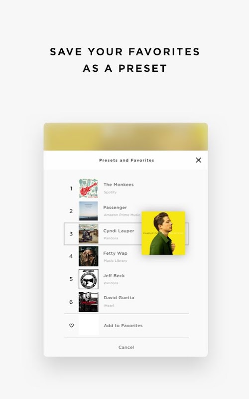 Personalize your home with “living” presets like Spotify’s “Discover Weekly” or Pandora’s “Thumbprint Radio.” Always have a fresh list of favorites a touch away, without having to even find your phone.