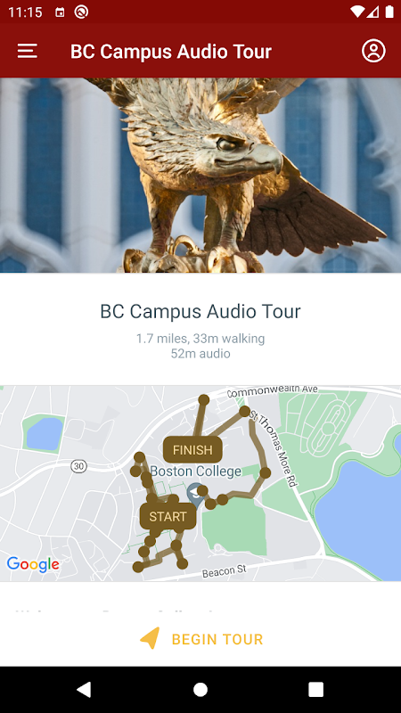The Boston College Welcome app is a single download that gives you access to a self-guided BC Campus Audio Tour, Commencement programming, and first-year student Weeks of Welcome.
