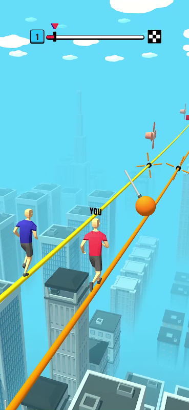 Try your best to balance on slack line while avoiding obstacles.