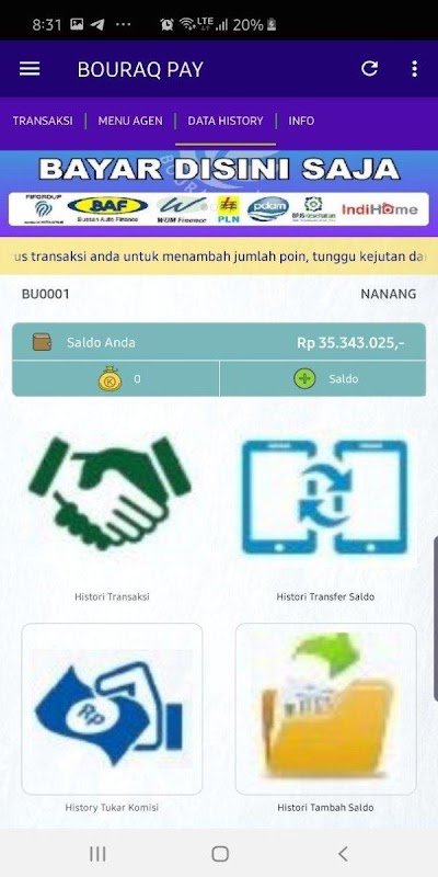 BOURAQ PAY android application is a free mobile application for loyal members of BOURAQ PAY wherever located. This application makes it easy for you to perform various transactions such as topping up pulses, purchasing electricity tokens, paying postpaid bills, purchasing game vouchers, etc.