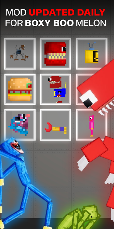 You should definitely try our Collection for Boxy Boo Playtime Project Mod for Melon Playground mobile app, The aim of this app is to help you Find the best mods for this mobile game like military vehicles, cars, weapons, buildings etc.