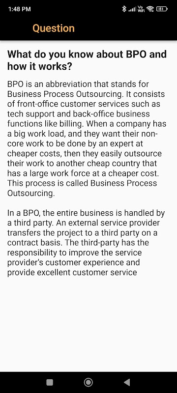 BPO Interview Questions: For those specifically interested in BPO, our app includes a dedicated section with over 100+ questions focused on BPO concepts. Deepen your knowledge and boost your confidence in BPO interview scenarios.