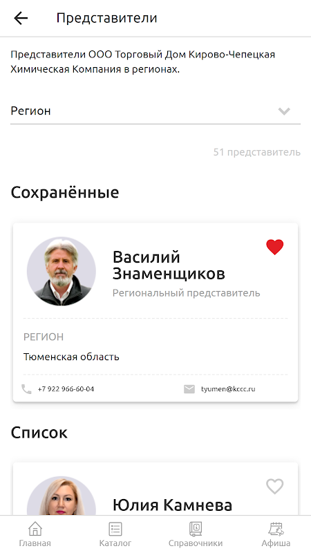 A seção Contatos contém informações sobre nossos funcionários no escritório central e nos escritórios regionais. Você pode entrar em contato com o gerente da região para obter informações abrangentes sobre a empresa e os produtos. Qualquer cartão de contato pode ser fixado no topo da lista.