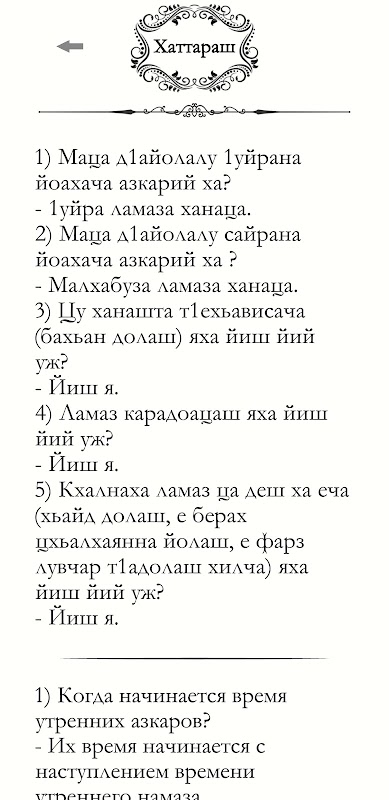 Ukh zhaina t1a b1ashag1teha da 1yranei sairanei wai Payhamaro (Allahla salot-salam hilda tsunna, tsun dezalashta a, tsun ashyabashta a, radyaAllah1u 1ankh1um, tzar tiehya A mel'min wolchoa traço a. Ukh duiasha (azkarasha) Dala nizatsa, t1argam (escudo) sanna loravergwa sag b1argah a, bozbuachalah a, khydolcha vocha h1amaeh a, x1ara diynahya uzha deshash hilcha.