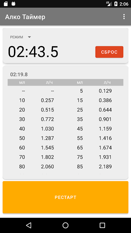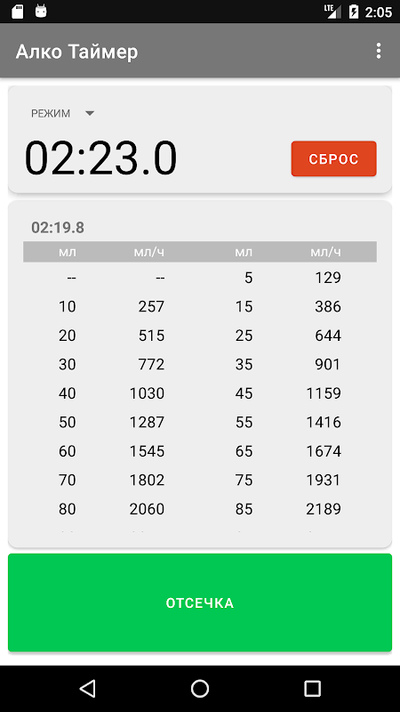 Алко Таймер - это помощник самогонщика. Приложение предназначено для самогонщиков. Встроенный калькулятор самогонщика рассчитывает скорость отбора спирта, дистиллята (ректификата) и другой жидкости при самогоноварении. Полученный результат вычислений скорости отбора спирта выводится в таблице. Удобство Алко Таймера в том, что нет необходимости перед каждым замером вводить измеряемый объем. Калькулятор скорости отбора спирта выводит сразу несколько результатов для разных объемов. Достаточно просмотреть нужный в таблице. Можно выбрать удобный для себя режим работы Алко Таймера. Их два: