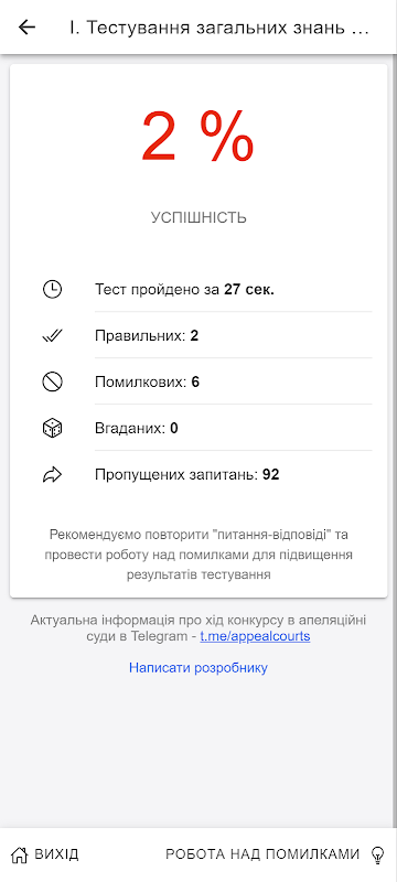 Simulador de tarefas de teste de acordo com a lista oficial de questões de teste (aprovada pela decisão do Supremo Tribunal de Apelações da Ucrânia de 15 de julho de 2024) para o exame de qualificação no âmbito da avaliação de qualificação de candidatos aos cargos de juízes de tribunais de apelação (teste oficial do tribunal)