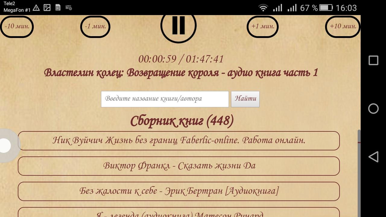 Há um painel de controle conveniente e pesquisa. Você não precisa se preocupar com o local em que parou de ouvir, pois o tempo de audição é gravado automaticamente e para cada livro separadamente! Isso permitirá que você ouça vários livros de áudio em paralelo!