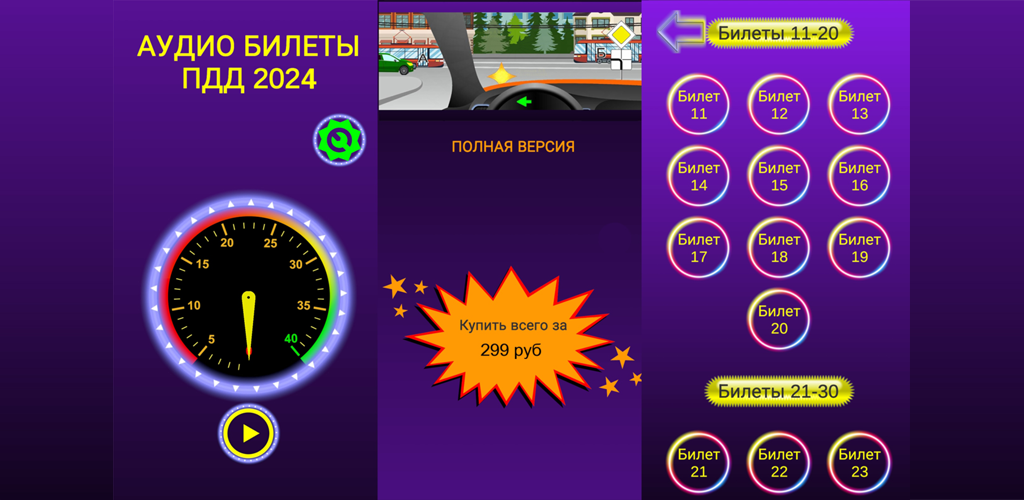A interface em forma de velocímetro lembra onde você parou de ouvir o ticket. Você sempre pode retornar ao mesmo lugar pressionando o ponteiro do velocímetro. Aprenda muito melhor o material sobre regras de trânsito e passe no exame sem erros!