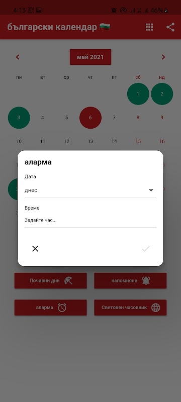 O calendário búlgaro tem feriados, lembretes, calculadoras, alarmes, aniversários.