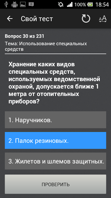 Назначение программы - подготовка работников ведомственной охраны к тестированию и сдаче периодической проверки.Программа позволяет пройти тестирование по списку из 129 вопросов 2015 года. Тестирование разбито по режимам - периодическая проверка и режим настраиваемого теста.