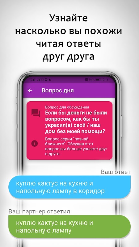 1. Todos os dias convidamos você e sua alma gêmea a responder a uma pergunta interessante. As perguntas são criadas por profissionais com base em pesquisas na área de relacionamentos.