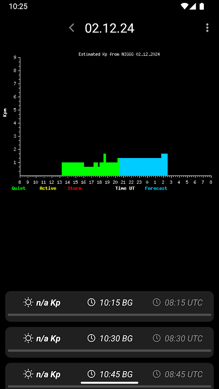 Приложението показва Геомагнитната активност за последните часове и за следващите 6 часа. Clique aqui e faça seu login para obter mais informações sobre este e outros serviços. Информация как се раазчитат данните може да намерите в самото приложение.