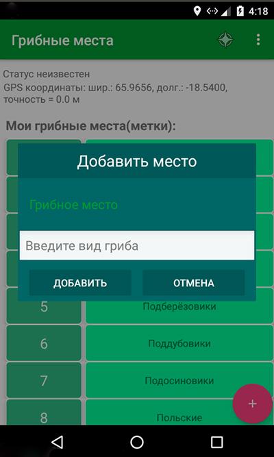 Бесплатное приложение для грибников. Позволяет отметить на карте место где вы нашли грибы чтобы проверить его в следующий раз.