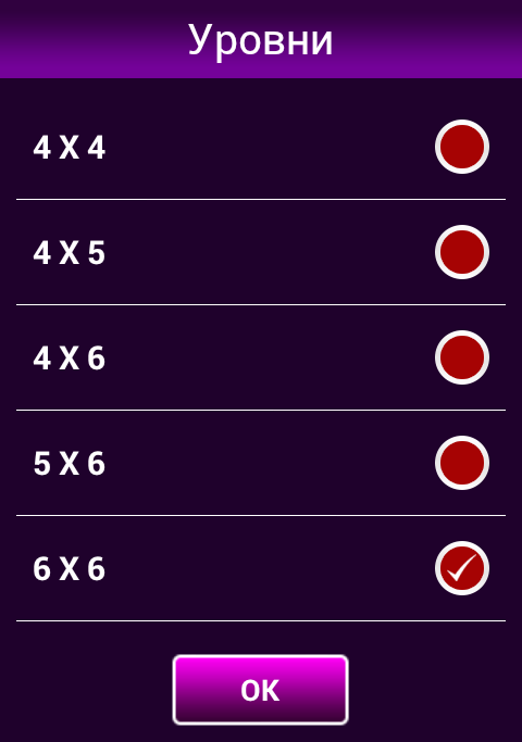 Несколько уровней сложности, которые определяются количеством выводимых иконок (картинок). Чем больше картинок тем сложнее найти одинаковые картинки.