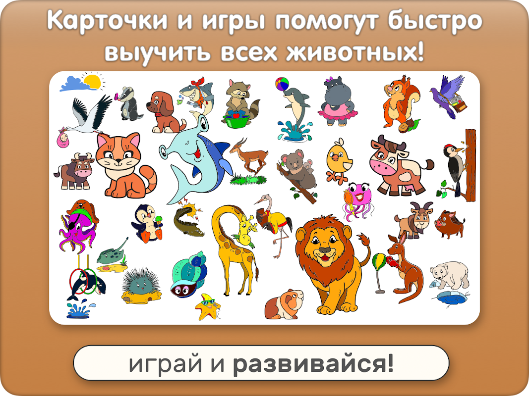 As fotos em alguns cartões são complementadas com vídeos curtos com animais. Esses vídeos são muito empolgantes para as crianças e as ajudam a memorizar novas palavras rapidamente.