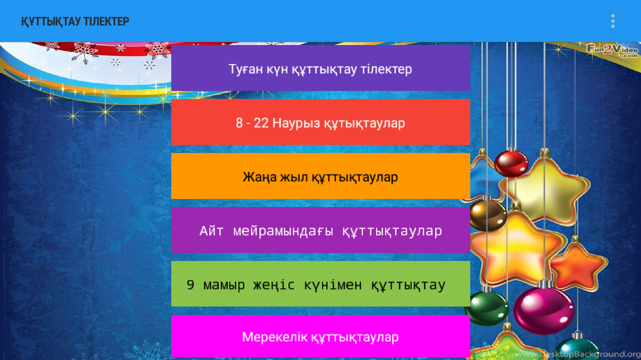 Туған күнге тілек Үйлену тойға Қыз ұзатуға Құдалық Мерейтой Сүндет той Тілашар тойы Шілдехана бесік тойы Тұсаукесер тойы Беташар Алтын той Күміс той 18 жас 25 жас 30 жас 40 жас 50 жас 55 жас 60 жас 63 жас 70 жас 80 жас Ораза айт Қадір түні Тылек Туган кун Казакша Қазақша құтықтаулар Куттыктаулар