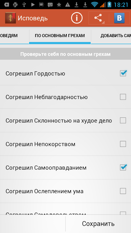 Внимание ! содержание "подсказок" для исповеди весьма спорное и для служителей Церкви, и для меня, разработчика этого приложения, хоть и сделано по литературе, продающейся в храмах .