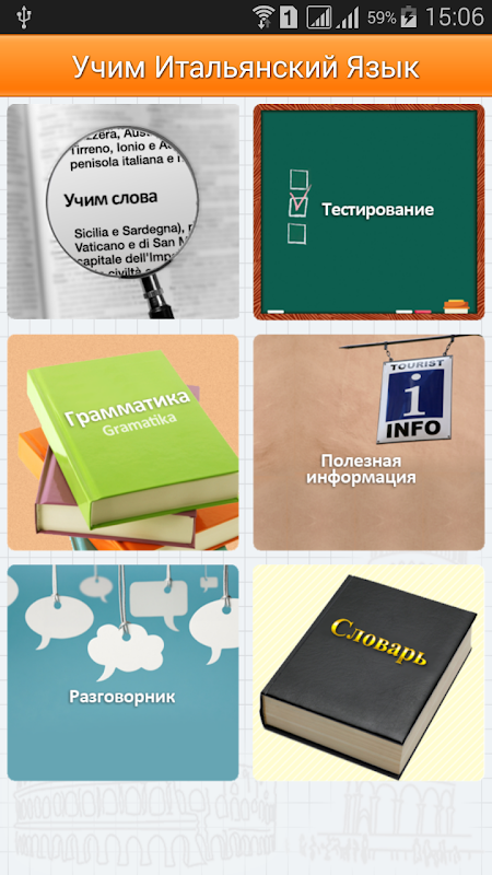 В программу входят уроки, тесты, разговорник, словари итальянско-русский и русско-итальянский, грамматика, полезная информация, карта с лучшими достопримечательностями Италии и все это не требует подключения к сети Интернет!