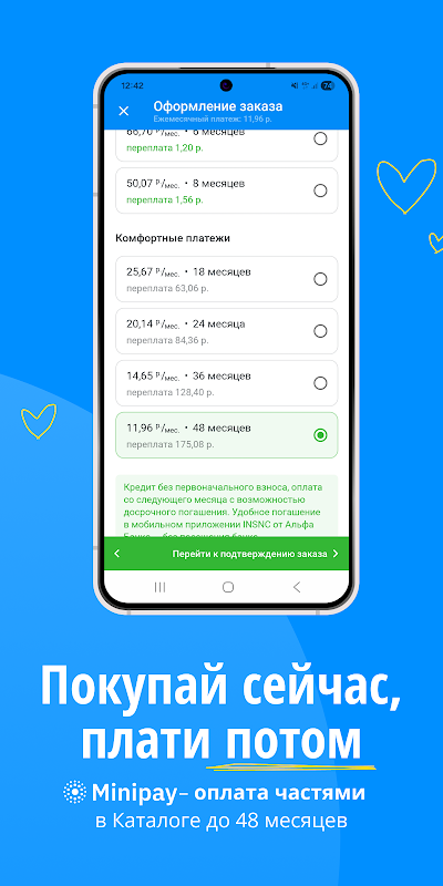 O Minipay é uma maneira conveniente e rápida de parcelar o pagamento do Alfa Bank diretamente no Catálogo Onliner. Com ele, você pode comprar o que quiser, dividindo os pagamentos em parcelas convenientes. Vantagens do Minipay: